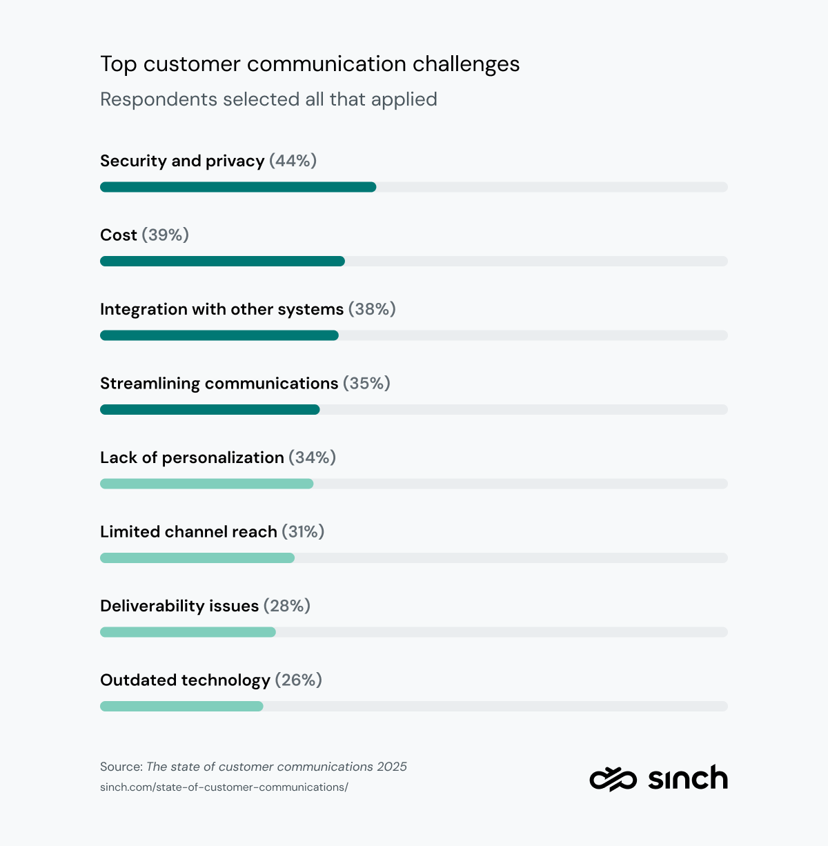 Abgesehen von diesen drei größten Herausforderungen ist klar, dass Unternehmen mit einer Vielzahl von Problemen in der Kundenkommunikation konfrontiert sind. Jede in unserer Umfrage vorgestellte Herausforderung wurde in mehr als 25 % der Fälle gewählt. Das bedeutet, dass eines von vier Unternehmen mit mindestens einer dieser Herausforderungen konfrontiert ist.