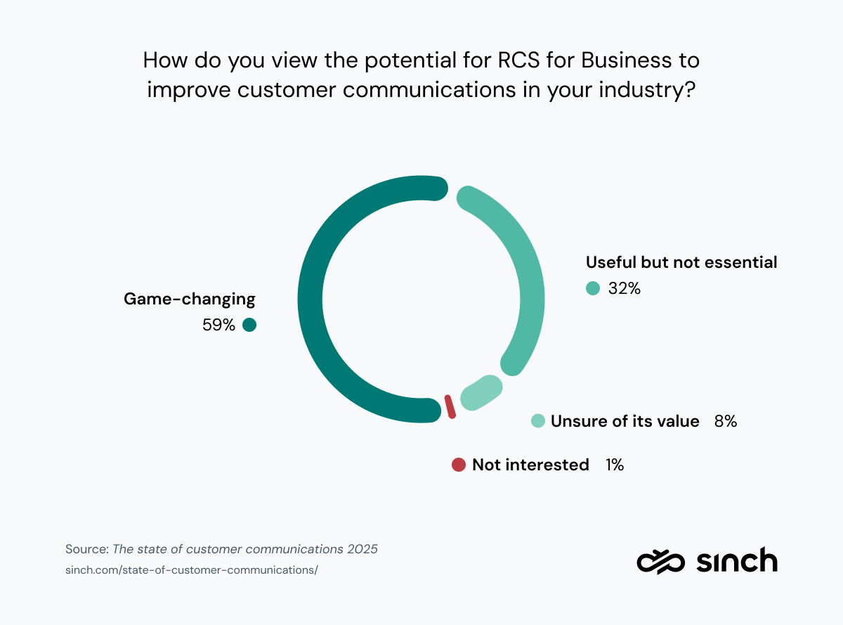 Unter denjenigen, die mit RCS vertraut sind, glauben viele, dass es eine ziemlich große Sache ist. Die Sinch-Umfrage ergab, dass 59 % der Befragten RCS als "revolutionär" für die Kundenkommunikation in ihrer Branche bezeichnen. Weitere 32 % glauben, dass RCS nützlich sein wird, auch wenn es nicht unbedingt notwendig ist. Nur 1 % ist nicht an RCS interessiert.