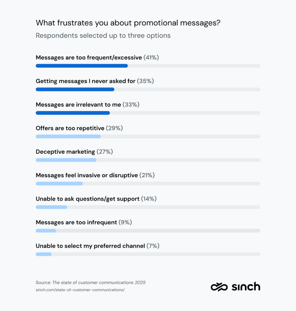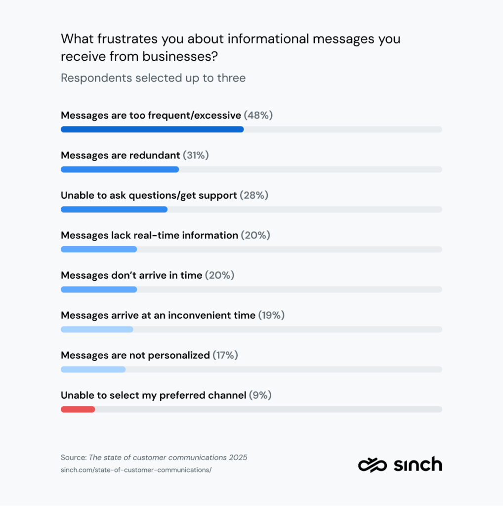 Es ist jedoch möglich, seinen Kundenstamm zu viel oder zu wenig zu informieren. Als wir die Verbraucher baten, uns mitzuteilen, was sie an dieser Art von Kommunikation stört, waren dies die drei größten Probleme: