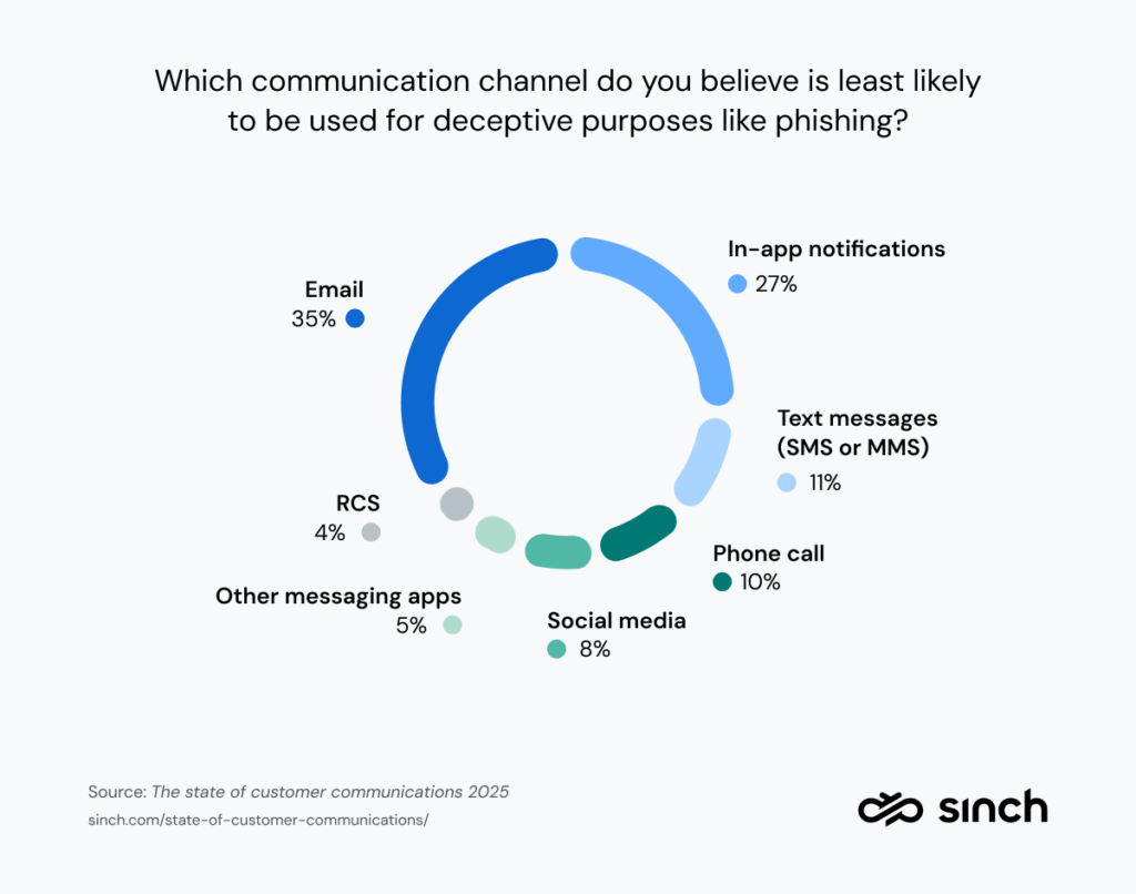 Die Realität? E-Mails sind ein sehr beliebtes Angriffsziel für böswillige Akteure, die versuchen, die Identität von Verbrauchern zu stehlen. In-App-Nachrichten (ausgewählt von 27 %) können sicherlich vertrauenswürdiger sein, aber sie sind nur verfügbar, wenn ein Nutzer bei der Anwendung angemeldet ist.