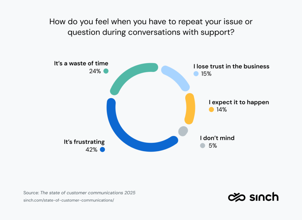 Die Untersuchung von Sinch ergab, dass 42 % der Verbraucher diese Erfahrung als frustrierend empfinden. Weitere 24 % geben an, dass sie ihre Zeit verschwendet haben, und 15 % verlieren das Vertrauen in Unternehmen, die den Überblick über Informationen während der Support-Interaktionen nicht behalten können.
